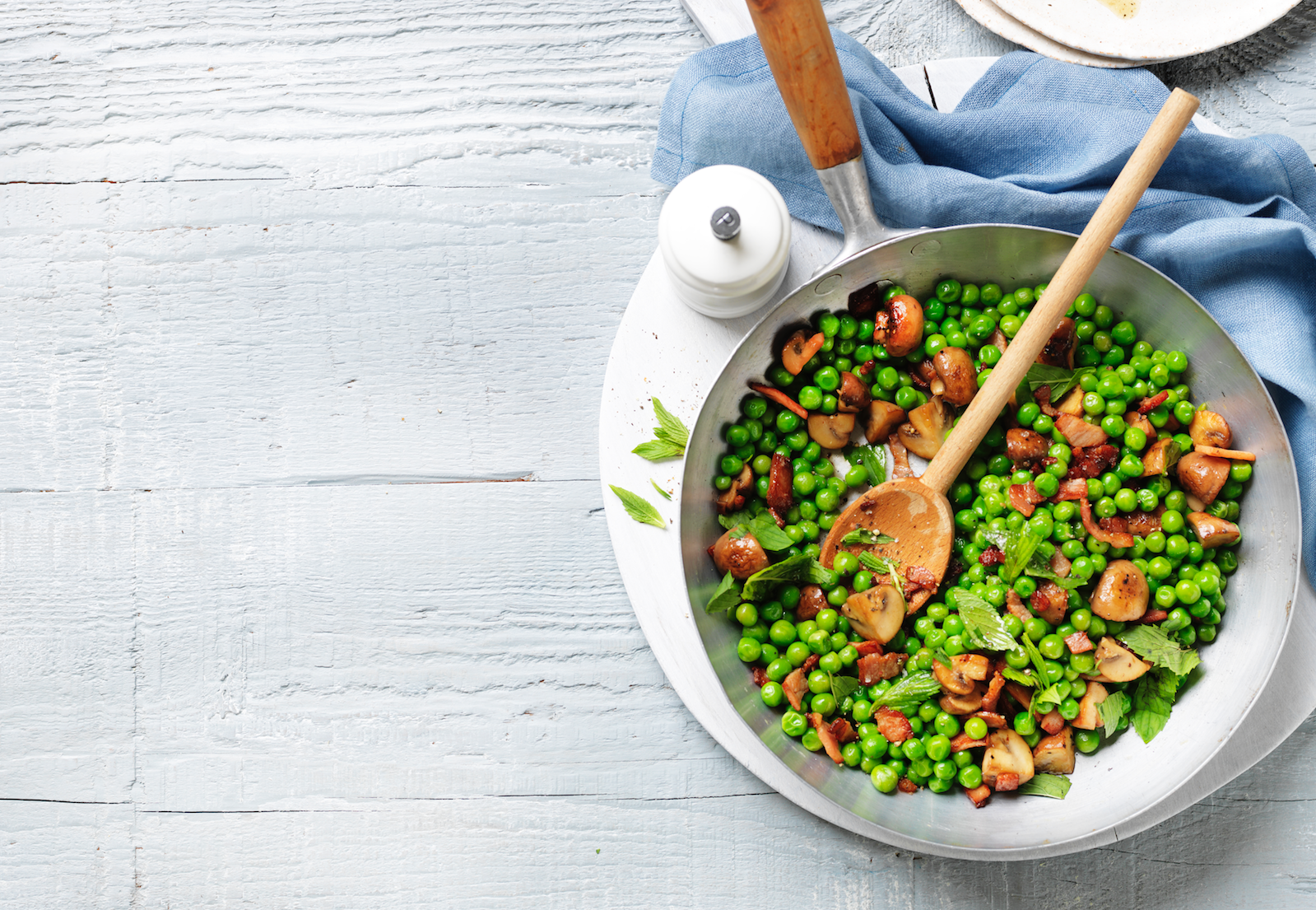 Reduce the heat to medium-high and melt half the butter in the pan. Cook the mushrooms for 5 minutes, tossing the pan regularly. Return the bacon to the pan with the peas and the remaining butter. Season with salt and pepper.