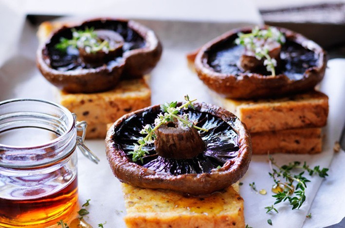 Place 1 mushroom on top of each French toast, top with thyme and serve, drizzle with a little extra maple syrup if desired.