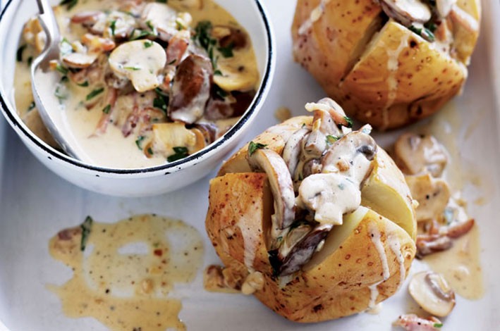 Cut a deep cross in top of each potato. Using a clean tea towel to hold the potato, squeeze the base gently to open up top. Spoon over the mushroom sauce and serve.