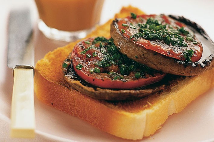 To serve; place the mushrooms onto the toast, top with tomato and drizzle with herb oil. Serve immediately.