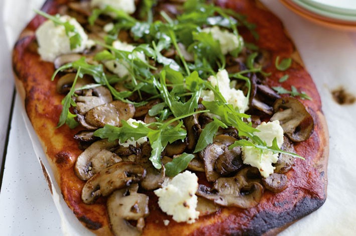Spread each pizza base with 2 tablespoons of the passata and spray lightly with oil. Turn off the burners under the flat plate. Place the pizza dough, still on the paper onto the hot flat plate. Close the barbecue hood and barbecue for 10 minutes until dough is light golden. Spread the remaining passata over the bases, top with mushrooms and crumble over the ricotta, close the hood and barbecue a further 5-7 minutes until ricotta is just starts to melt. Remove pizzas to a board, top with rocket, season with salt and pepper and serve.