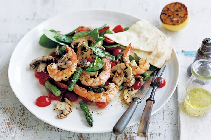Add tomatoes and prawns to mushrooms and asparagus, toss gently to combine. Spoon onto a large platter, add spinach leaves and season. Drizzle with extra virgin olive oil and juice from barbecued lemons. Toss gently and serve with barbecue ?at bread.