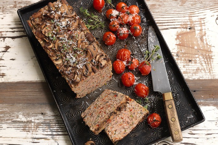 Meanwhile, increase oven to 220°C fan-forced. Place tomatoes onto a greased baking tray. Drizzle with remaining oil. Season.Roast for about 5 minutes, or until skins start to split.Turn meatloaf onto a tray, thenturn upright. Sprinkle over remaining parmesan, slice and serve with roasted tomatoes.