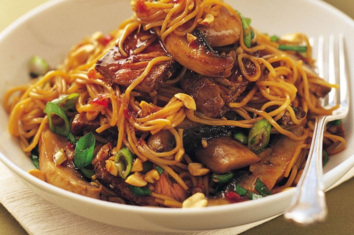 Combine kecap manis, sweet chilli sauce and oil in screw top jar. Shake well. Slice steak into 1 cm-thick slices. Add to the noodles with mushrooms, green onions, peanuts and dressing. Gently toss to combine. Serve.