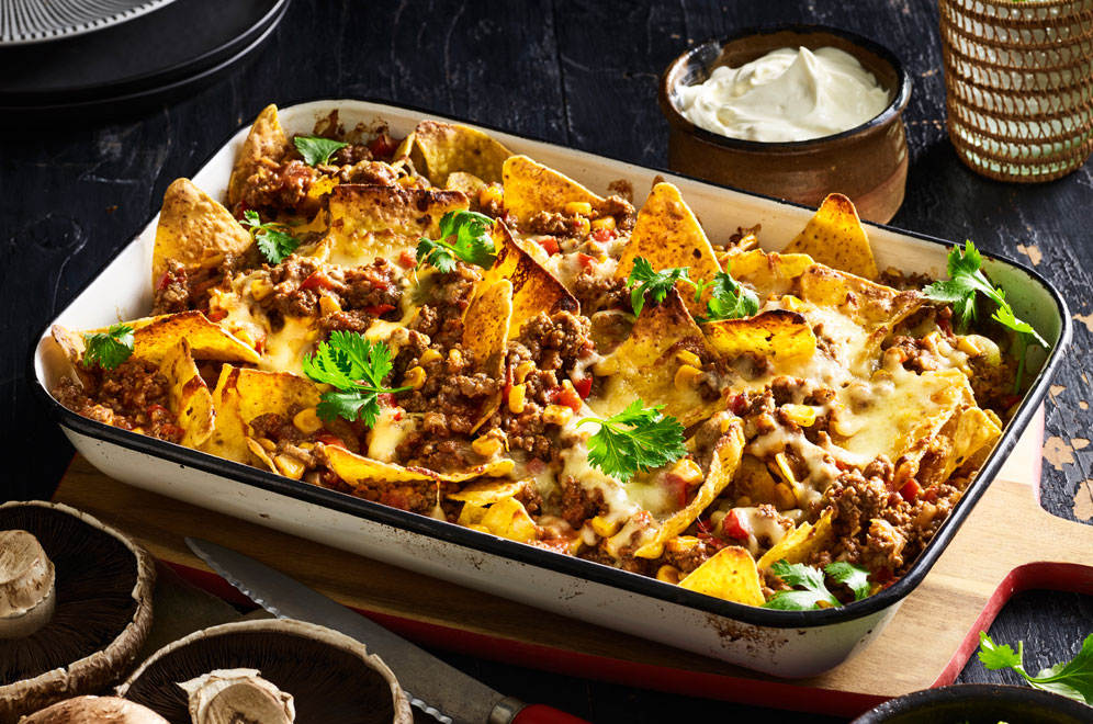 Preheat a grill on high. Place half the corn chips in an oven safe dish, cover with a third of the cheese. Place under the grill for 3 minutes. Add half the mince then layer with the remaining corn chips and half the remaining cheese. Grill for a further 3 minutes. Finish with remaining mince and cheese and grill for 4 minutes until golden and the cheese is melted.