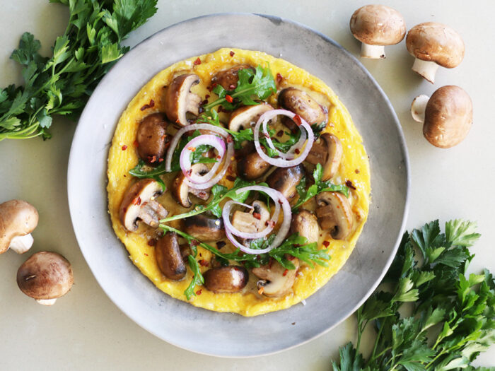 Place a heavy base frypan on medium heat with a drizzle of olive oil. Add the mushrooms (cooking them in two batches is ideal depending on your pan size), and sauté while stirring until they soften and become golden in colour. Remove from the frypan and add three-quarters of them to the egg mixture and stir through.
