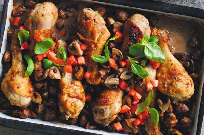 Season the flour with salt and pepper. Place into a plastic bag with dried herbs, add the chicken legs and shake to coat. Remove the sausage meat from the casing and break into chunks using wet fingertips. Discard the casings. Preheat oven 160°C fan-forced.