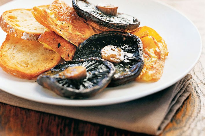 Cut the omelettes in half and divide between serving plates. Top with mushrooms and season with salt and pepper. Serve with toasted bread.
