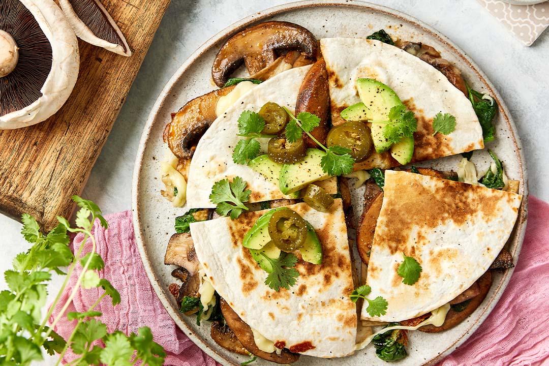 Warm up a sandwich press or fry pan to medium-high heat and lightly oil. On it, place one tortilla, add half the mushroom mixture, baby spinach, cheese, and drizzle over the optional hot sauce. Top with tortilla. Press down and cook for 3 minutes. Carefully flip over and cook the other side. Remove from the pan and repeat the process.