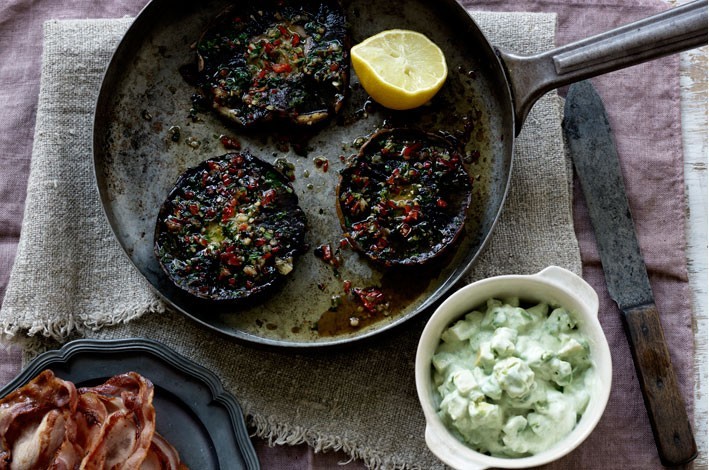 Put pancetta into a large non-stick frying pan over medium-high heat, cook 3-4 minutes each side until golden. Remove to a plate. Increase heat to high. Add the mushrooms stalk-side down, cook for 3-4 minutes on each side or until just tender.