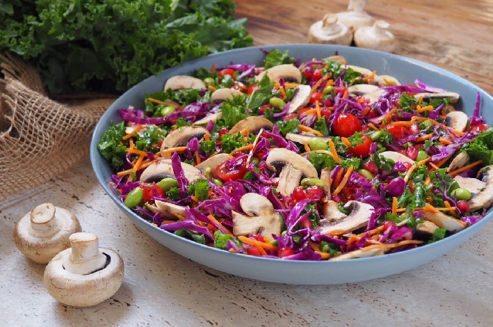 Cook edamame beans in a pot of boiled salted water for 2 minutes. Drain, then refresh in cold water. Combine mushrooms, tomato, kale, cabbage, carrot, pomegranate seeds and chives in a large salad-serving bowl.