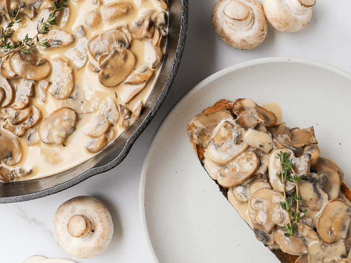 In the same skillet, add the butter and the sliced mushrooms and sauté for about 5 minutes, stirring occasionally, until the mushrooms are browned and tender.
