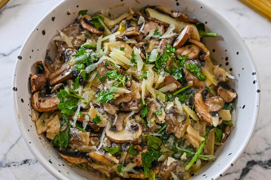 Add butter and sliced mushrooms and cook for about 2 minutes, then stir through ricotta cheese and veggie broth until melted and smooth. Stir through parmesan cheese, spinach and zested lemon.