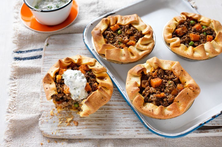 Place an oven tray into the oven. Preheat tray and oven to 220°C. Lightly grease 6 x 8cm base measurement pie pans. Cut 1 x 20cm circle from each sheet shortcrust pastry. Use to line bases and sides of pans. Divide mince mixture between pie tins. Fold excess pastry over filling to partially cover. Brush pastry with water and season. Place pies onto hot tray. Bake for 20-25 minutes or until golden. Serve.