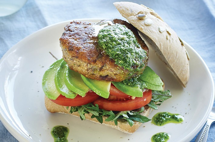 Form into four patties, then fry in vegetable oil in a pan over a moderate heat for 10 minutes, turning often, until firm to touch. Place the base of the ciabatta rolls on a plate, top with salad leaves, sliced avocado and tomato, add patties, and then drizzle over pesto.