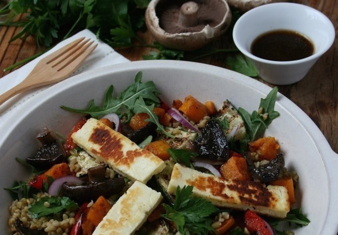 In a large serving bowl or platter, combine the freekeh, mushrooms, zucchini, capsicum, red onion and rocket. Mix through salad dressing and toss well. Layer with grilled haloumi, serve and enjoy.