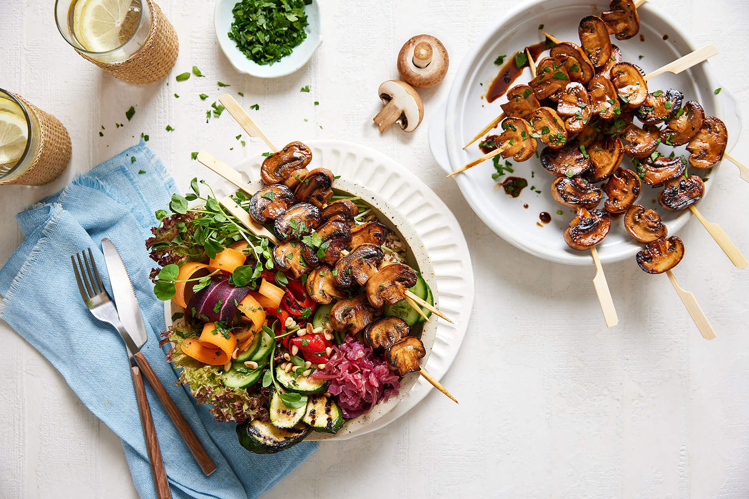 Thread the marinated mushrooms onto wooden skewers and place them on the flat BBQ plate. Once the mushrooms start to caramelise and lightly char gently turn them over and cook the other side for a few minutes. Remove and set aside.