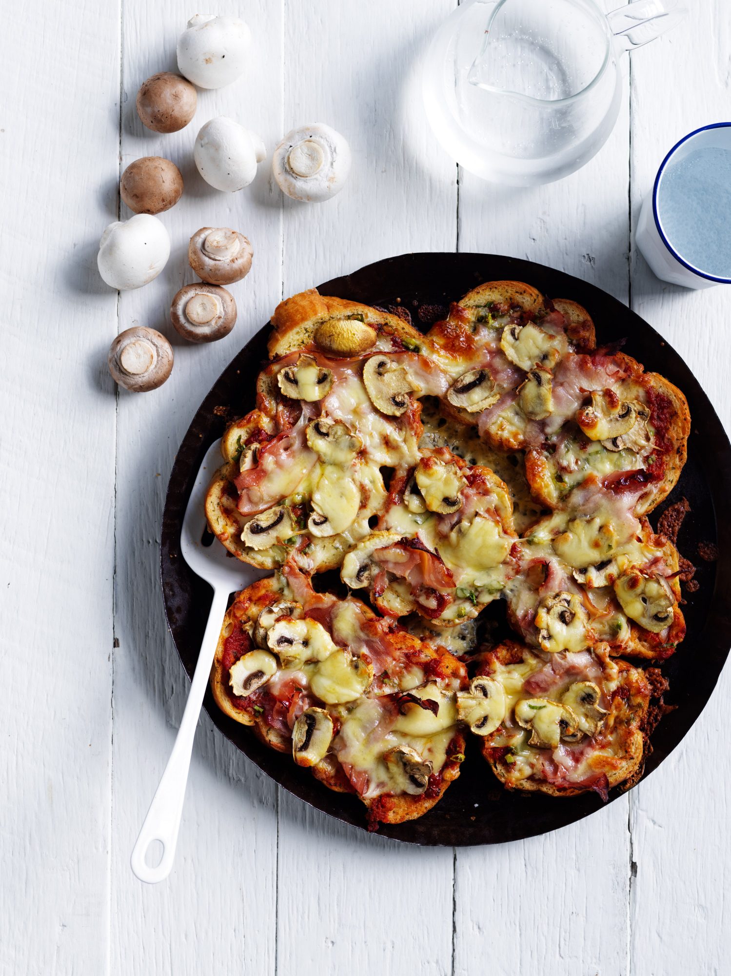 Preheat oven 200°C fan forced. Lightly grease two pizza trays. Arrange the bread, buttered side up on the pizza trays.