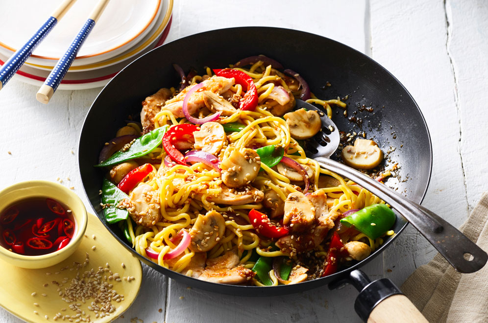 Heat half the oil in a wok over high heat. Add onion and mushrooms stirring constantly for 3 minutes until softened and slightly brown. Add snow peas and capsicum, cook for 2 more minutes, then set aside. Reheat the remaining oil until smoking. Add chicken and cook for 4 minutes, stirring frequently until cooked through. Add soy sauce mixture and leave to bubble for 2 minutes, to thicken slightly.