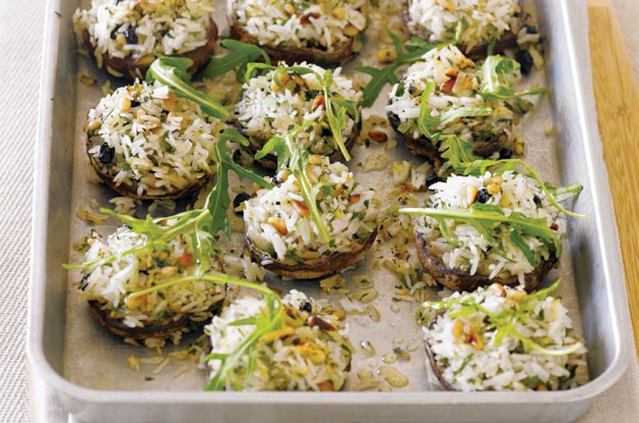 Preheat oven and roasting pan to 220°C fan forced. Remove stalk from the mushrooms. Pile the pilaf onto the mushrooms. Place mushrooms into hot roasting pan and roast for 10 minutes until just tender. Season with salt and pepper.