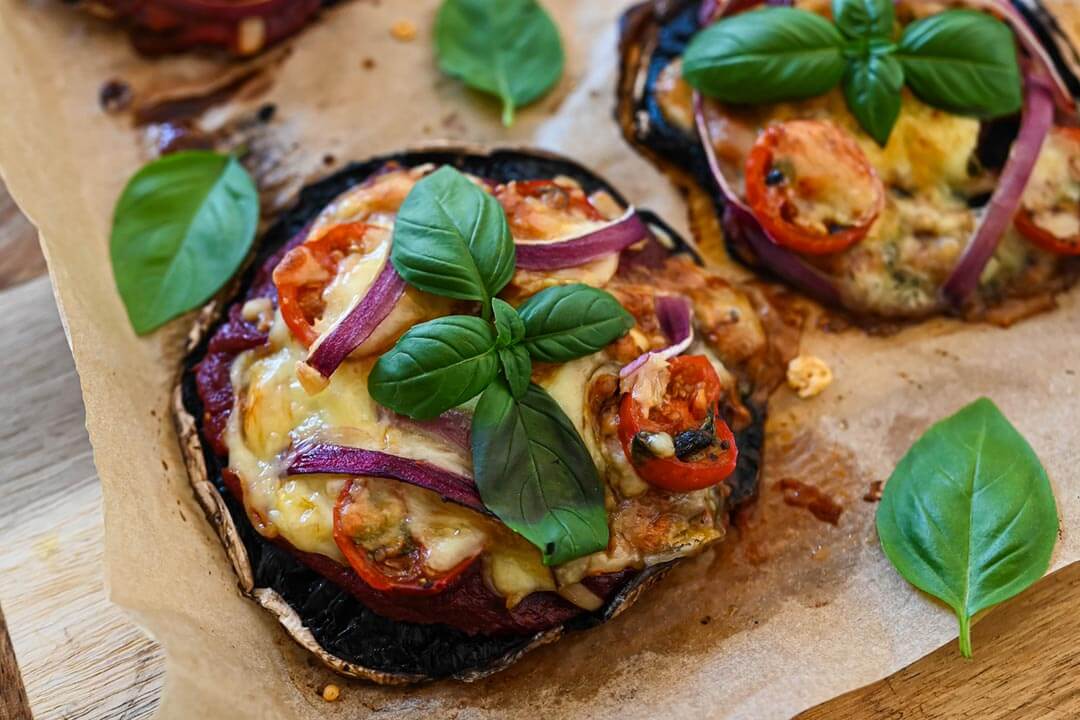 Drizzle olive oil on the underside of the portobello mushrooms. On top of them, add the pizza sauce, followed by the mozzarella cheese, then the sliced cherry tomatoes and red onion. Then sprinkle seasoning over them.