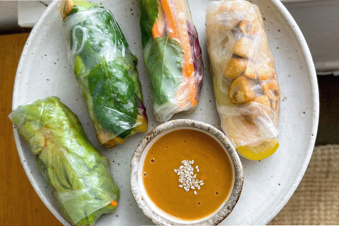 To assemble, dip the rice paper rolls in a shallow bowl of warm water and place onto a plate. Layer some fresh herbs, a few small cos lettuce leaves, the vegetables, the vermicelli noodles and the mushrooms.