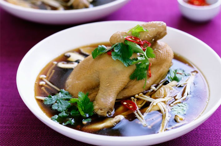 Strain the stock, discarding the solids. Return the stock to the wok and bring to the boil. Add oyster mushrooms and remaining shiitake mushrooms. Cook for 2–3 minutes or until just tender. Taste and adjust adding sugar if it needs sweetening or soy for salt. Ladle hot stock over the chicken and mushrooms, top with coriander and chilli. Serve.