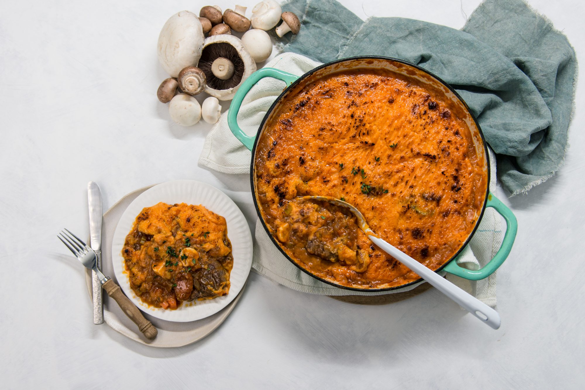 To finish the pie, stir the beef through the saucy mixture. Cover with the sweet potato mash using a spatula. Scrape the surface with a fork to create small peaks.