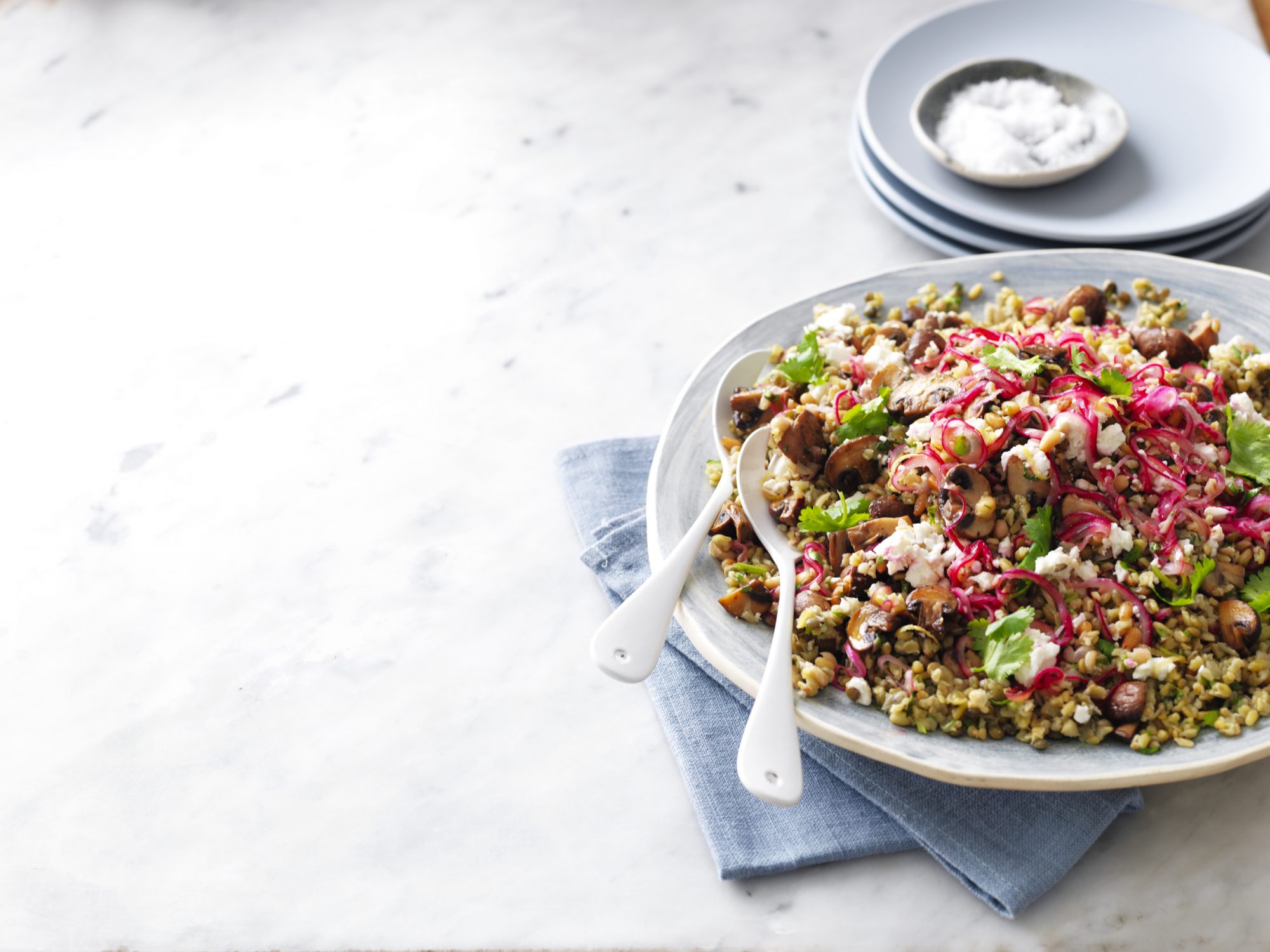 Combine the lemon zest and juice with the onion in a large bowl. Add the remaining oil, cooled grain blend, mushrooms, coriander and pine nuts and toss to combine.