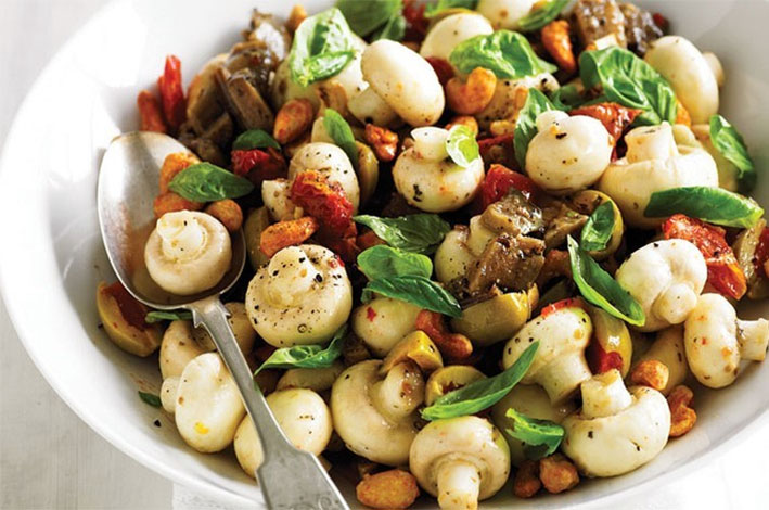 Combine the olive oil, lemon juice, mustard and salt and pepper in a large glass bowl, whisk until well combined. Add the mushrooms and stir to coat. Cover and refrigerate for 30-60 minutes to allow the mushrooms to absorb the dressing.