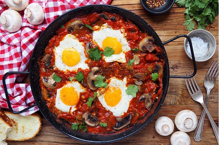 Make little wells in the mixture and break the eggs into the wells. Simmer for a further 10 minutes until cooked. Cover with a lid if you want to speed up the cooking process. When the egg whites are cooked through but the yolk is still soft - the eggs are done.