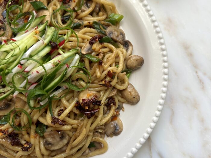 Add the sliced garlic and stir for 30 seconds, then season with salt and pepper. Reduce the heat to low, then add the cream and the lemon thyme. Stir continuously with a rubber spatula until the mushrooms are well coated and the sauce turns shiny and luscious.