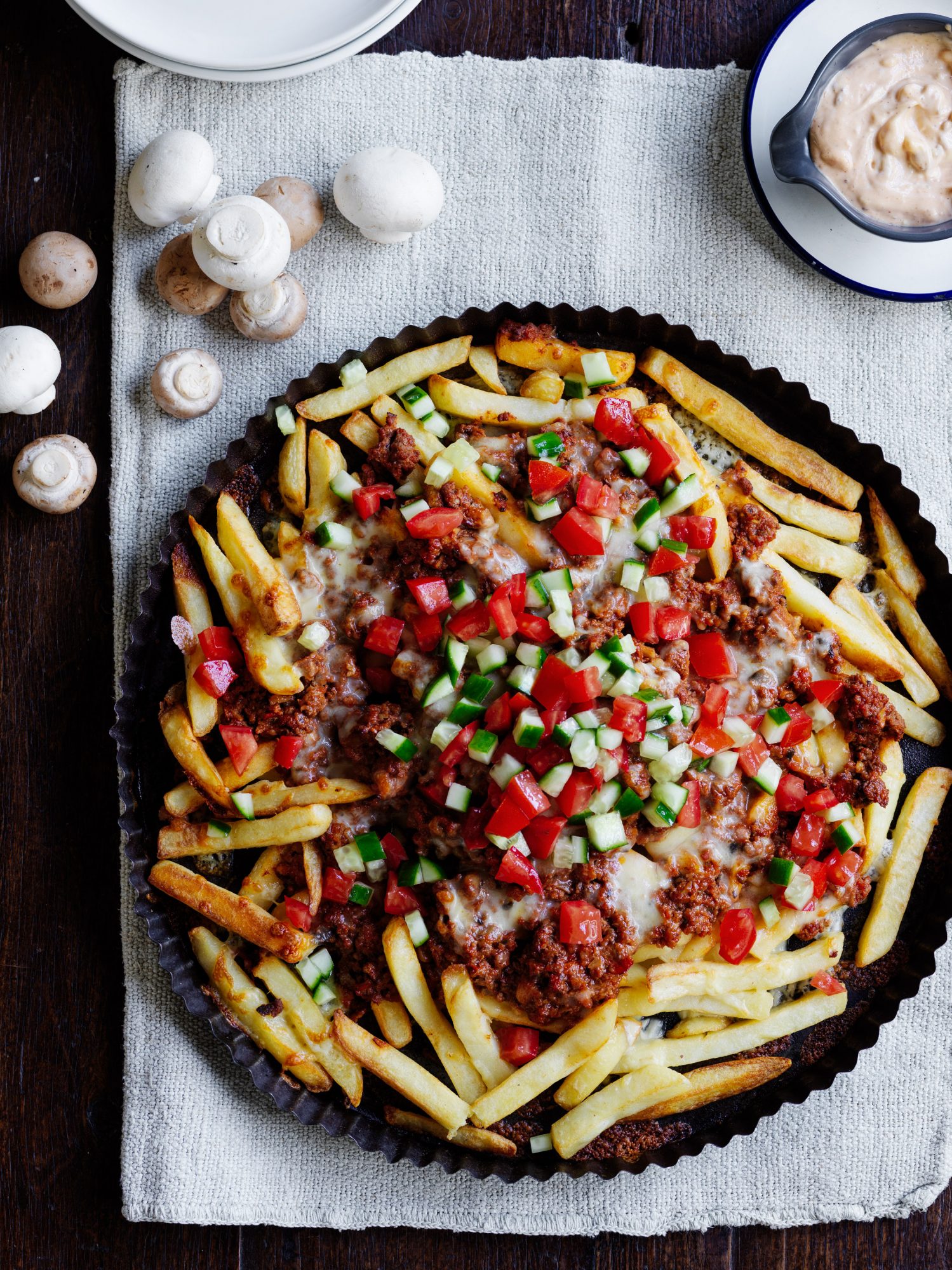 Remove roasting pan from oven. Spoon over the bolognese. Sprinkle with cheese. Return to oven. Bake for a further 10 minutes, or until cheese is melted. Top with combined tomato and cucumber. Serve with chipotle mayonnaise.