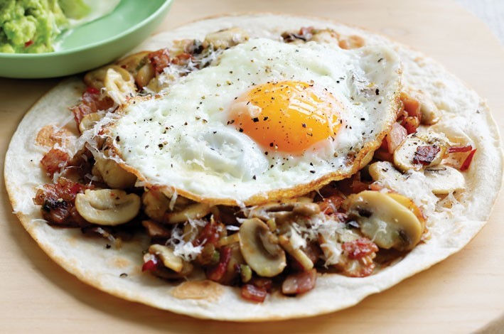 Spoon mushroom mixture evenly over the top of the tortillas. Return the pan to the heat and spray light with more oil. Cook eggs 2 at a time for 2-3 minutes or until cooked to your liking. Top each tortilla with egg, season with salt and pepper then sprinkle evenly with cheese.