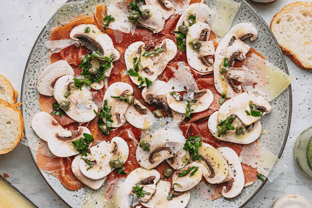 Arrange the meat slices on a serving plate, overlapping them slightly to create a thin layer. Lay sliced mushrooms on top, and scatter around the cheese. Season with pepper.