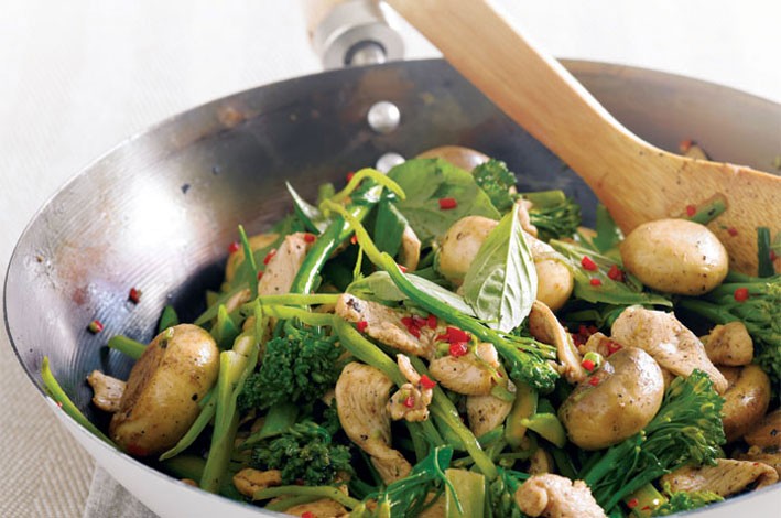 Heat the wok until hot. Spray the mushrooms with oil then add to the hot wok. Stir-fry 2-3 minutes until light golden. Add the marinade and cook 2 minutes. Add the broccolini and stir-fry 1 minute then add the snow peas and return the chicken. Stir-fry for 1 minute. Remove from the heat, add the basil, toss to combine and serve over rice.