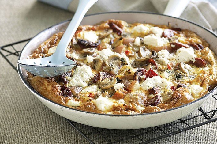 Heat 1 tbs of the oil in a deep 24cm (base) frying pan over high heat. Add mushrooms and cook for 4 minutes. Remove to a plate. Add remaining oil, chorizo and warm potatoes and cook for 5 minutes until light golden. Return the mushrooms to the pan, add onions and capsicum and stir to combine.