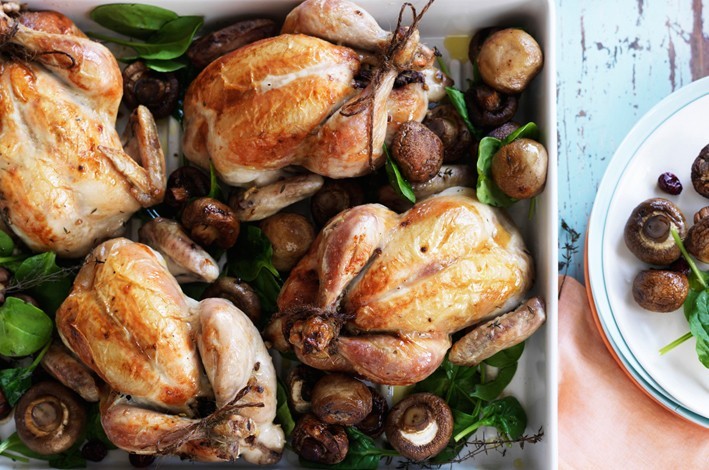 Remove spatchcocks to aclean pan and roast a further 5-10 minutes until golden and cooked through. Toss the spinach leaves and remaining craisins with roasted mushrooms and serve with spatchcocks.