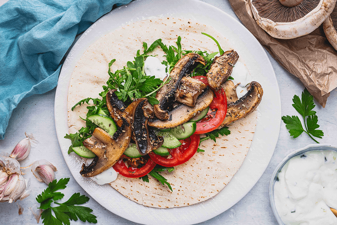 To assemble the gyros, spread 1–2 tablespoons of tzatziki sauce on each pita bread. Top with rocket, sliced tomatoes, cucumber slices and cooked capsicum and mushrooms.
