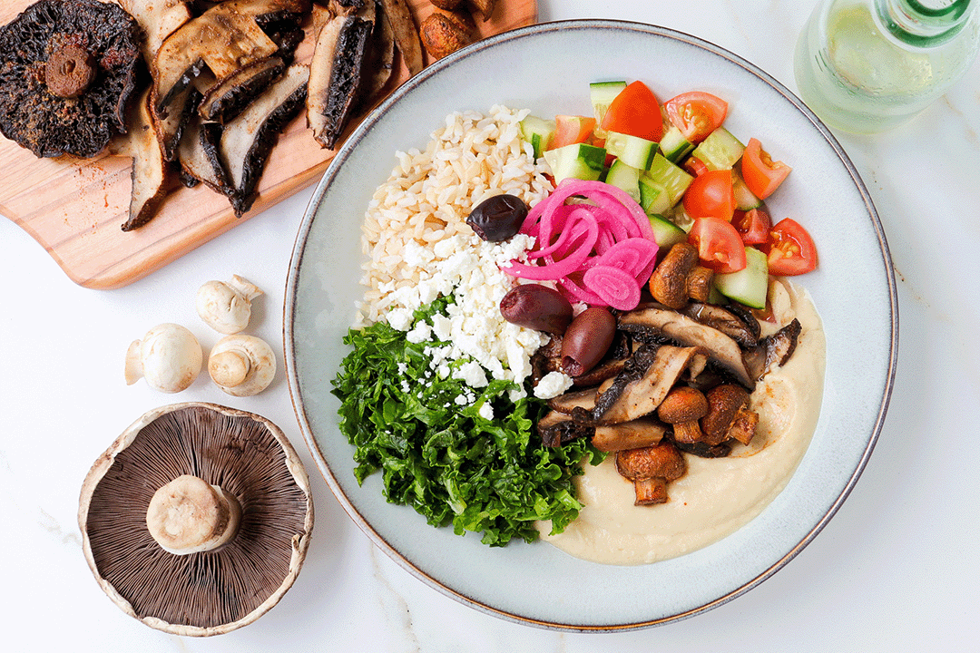 To serve, divide the ingredients between 2 bowls – in each, ¼ cup hummus; half the cucumber and tomatoes; ½ cup brown rice; ½ cup kale or spinach; and half the mushrooms plus their juices.