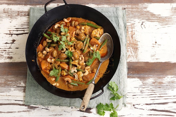 Add cauliflower and sweet potato and stir to coat in spice mixture. Add stock and coconut milk. Bring to boil. Cover with lid. Simmer, stirring occasionally over a medium-low heat for about 15 minutes, or until potato is tender. Remove lid. Add beans and simmer, uncovered for about 5 minutes or until beans are tender. Serve. Sprinkle over cashews and coriander. Serve with basmati rice.