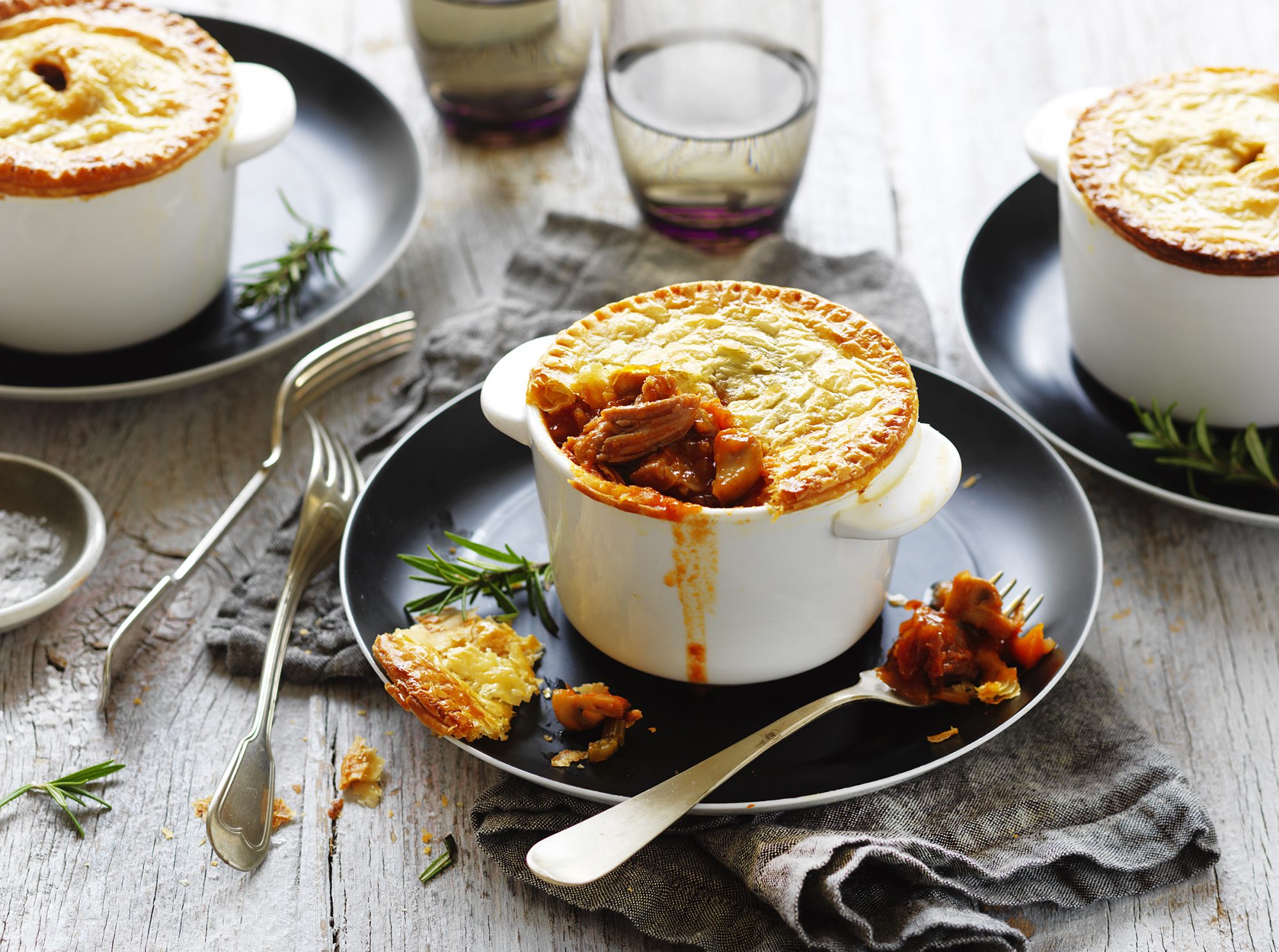 Increase oven to 190°C fan-forced. Place pastry onto a board to defrost. Cut 4 x 11cm rounds from pastry. Top pies with pastry. Press edges with a fork to seal. Brush with egg and cut a small cross into the centre of each. Place pies onto a baking tray lined with baking paper. Bake for 25-30 minutes or until pastry is puffed and golden. Serve.