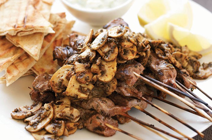 Place skewers onto plates, spoon over the mushrooms and serve with pita bread, tzatziki and lemon wedges.