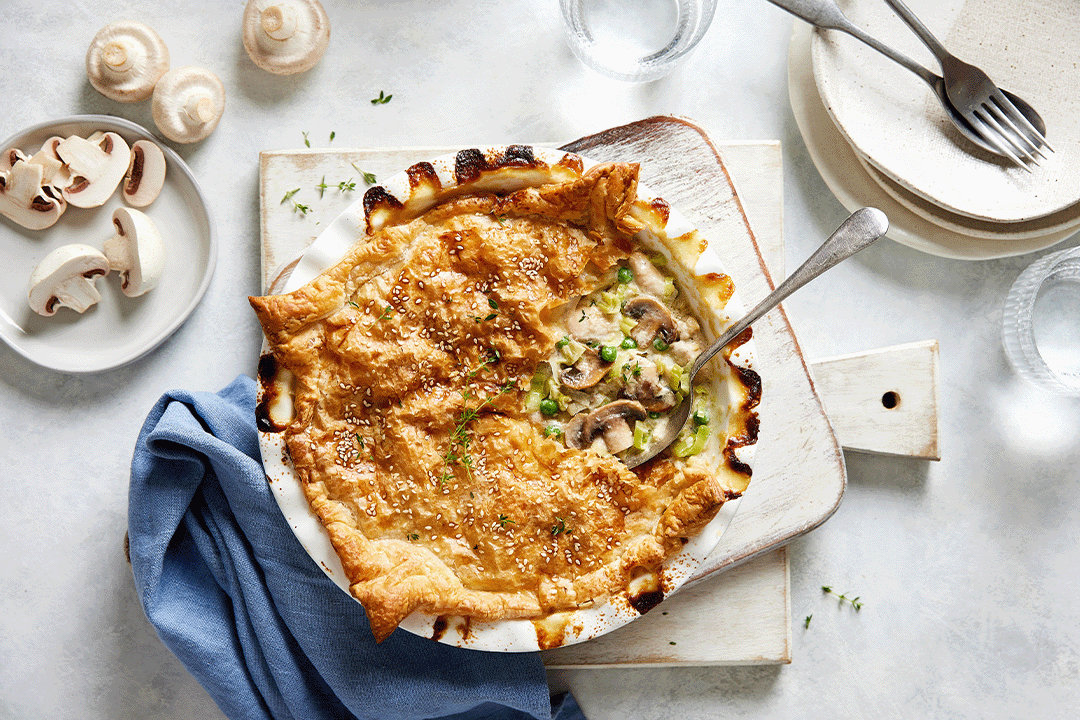 Spoon out the mixture into a large family-size pie dish, lay the pastry sheet over the top and lightly tuck it in around the sides. With the tip of a sharp knife, make two indents in the middle of the pastry.