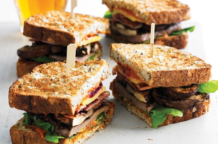 Place 4 slices toast on clean board. Combine the mayonnaise and chili jam. Use half to spread over the toast. Top with rocket, steak, mushrooms, cheese, bacon and beetroot. Spread remaining mayonnaise mixture on remaining toast. Sandwich together and skewer with toothpicks or cocktail sticks. Cut in half and serve with hot chips if desired.