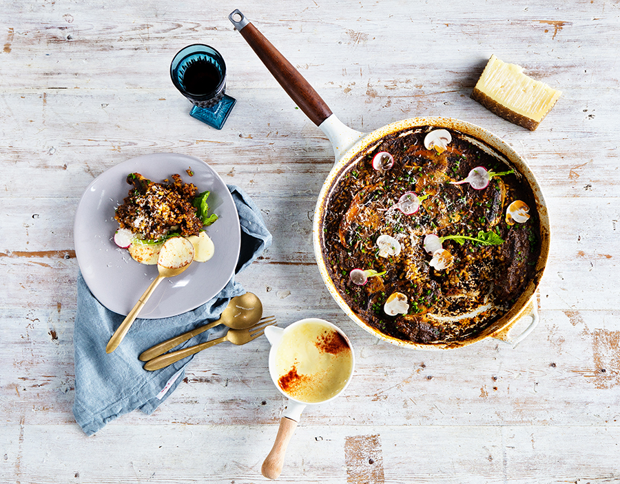 Season to taste with salt and freshly ground black pepper and garnish with chives, thinly sliced button mushrooms, radish and grated manchego cheese.