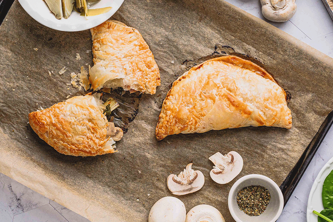 Spread the pastry with pizza sauce, leaving about a 1cm edge around. Top with herbs, cheese, ham, sliced mushrooms and artichokes down one side of