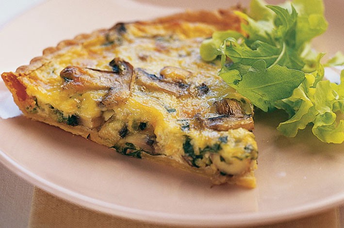 Spread the spinach and mushroom mixture over the base of the pastry shell. Top with cheese. Beat the eggs, cream, milk and salt & pepper in a jug with a fork until well combined. Pour the egg mixture over the mushroom and cheese mixture and bake in preheated oven for 20-25 minutes or until the filling is set. Allow to cool for 5 minutes before slicing.