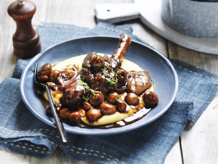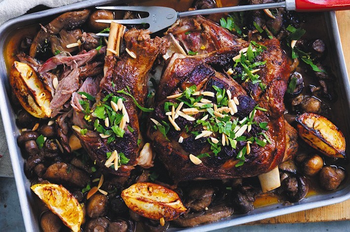 Place the lamb on top of the mushrooms. Add the lemon wedges. Place a sheet of baking paper right down on the surface of the lamb, then cover tightly with a lid or 2-3 layers of foil. Roast for 5-6 hours or until lamb meat falls from the bone easily.
