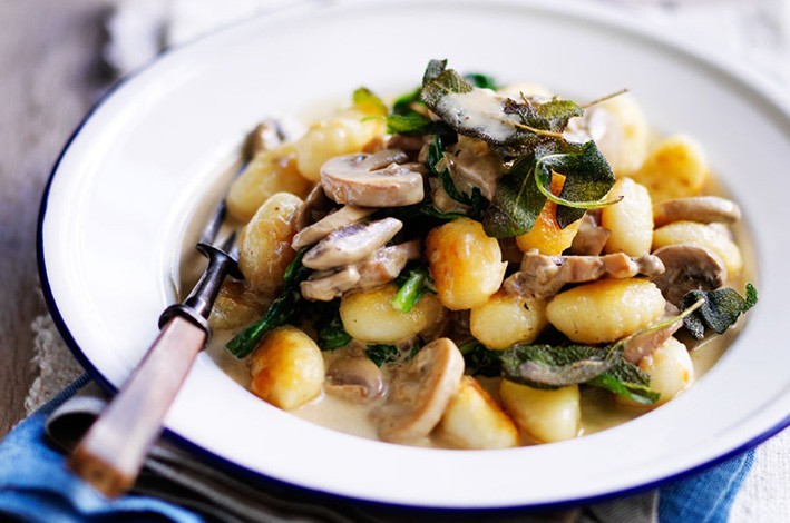Heat remaining oil in a large frying pan over medium-high. Add sage and cook for 2-3 minutes then remove to a plate. Increase heat to high, in two batches, add gnocchi to pan and cook 2 minutes or until golden on both sides.